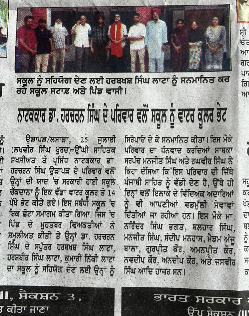 Dr. Harcharan Singh’s family donates water cooler and fans to school